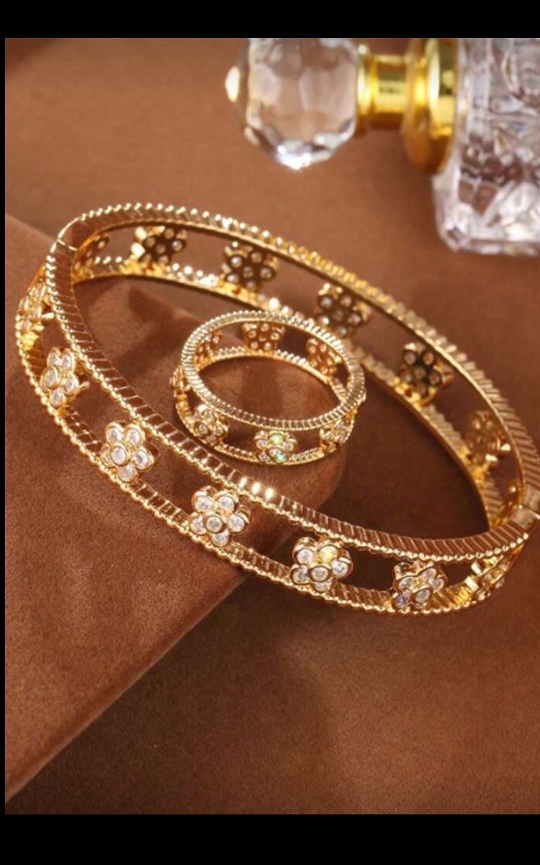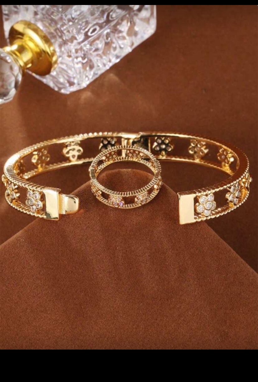 أضيفي لمسة من الرقي إلى إطلالتك مع هذا الطقم الذهبي الفاخر المكوّن من سوار وخاتم بتصميم زهري متقن. يتميز الطقم بزخارف زهرية دقيقة مرصّعة بأحجار لامعة تمنحه بريقًا أنثويًا يأسر الأنظار. يجمع بين الأناقة الكلاسيكية واللمسة العصرية، ليكون خيارًا مثاليًا للمناسبات الخاصة أو كهدية راقية لمن تحبين.